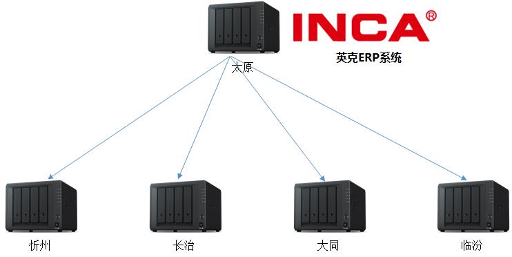 五個(gè)分公司各采購一臺(tái)DS918+,以太原為中心,向其它分公司的DS918+進(jìn)行數(shù)據(jù)實(shí)進(jìn)下發(fā)(單向),同時(shí)太原中心的存儲(chǔ)與英克ERP進(jìn)行了集成(JAVA二次開發(fā)),這樣,ERP的業(yè)務(wù)數(shù)據(jù)將自動(dòng)存儲(chǔ)到DS918+的文件夾,隨后下發(fā)到其它分公司。