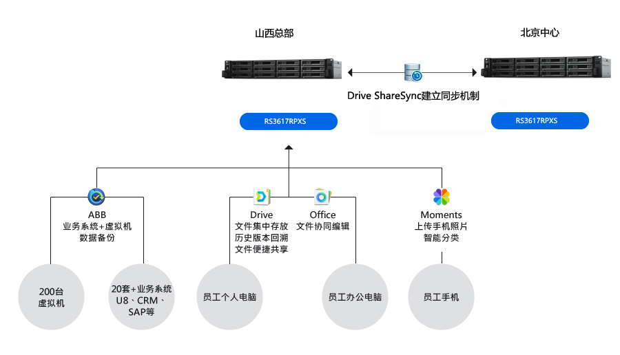 一份備份數(shù)據(jù)對公司的安全需求來說還不夠,借用群暉又進(jìn)一步打造了異地備份容災(zāi)方案。振東制藥山西總部的 RS3617RPXS 的備份數(shù)據(jù),通過群暉 Drive ShareSync多分點同步功能復(fù)制到北京分公司的 RS3617RPXS 中。支持排程備份計劃。