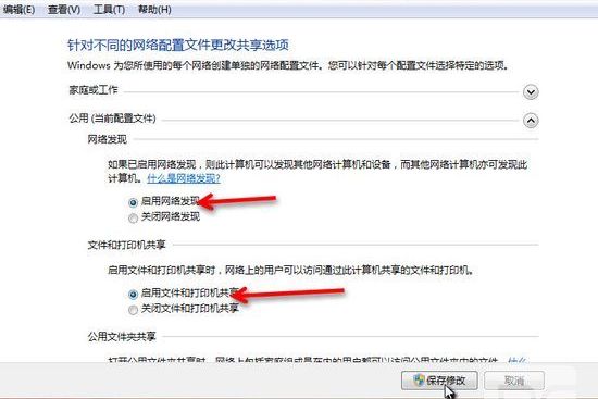 選擇 公共網(wǎng)絡(luò)---選擇以下選項(xiàng):?jiǎn)?dòng)網(wǎng)絡(luò)發(fā)現(xiàn)------啟動(dòng)文件和打印機(jī)共享-----啟用共享以便可以訪問網(wǎng)絡(luò)的用戶可以讀取和寫入公用文件夾中的文件(可以不選)----關(guān)閉密碼保護(hù)共享( 注釋:其他選項(xiàng)默認(rèn)即可!)